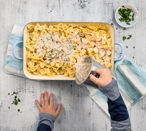 Petersilie mit Käse, Rahm, Milch, und Tomatenpüree verrühren, würzen, über die Teigwaren giessen.