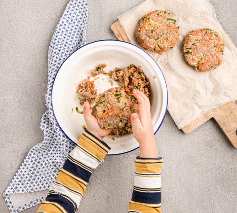 Rüebli schälen, mit der Zucchetti an der Röstiraffel in eine Schüssel reiben. Fleisch, Paniermehl und Salz beigegeben, von Hand gut kneten, bis sich die Zutaten zu einer kompakten Masse verbinden. Masse mit nassen Händen zu 4 Hacktätschli formen, etwas flach drücken.