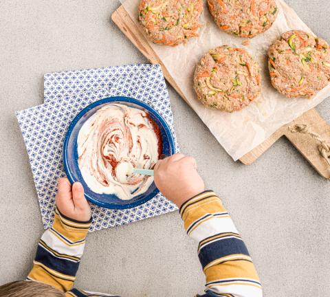 Crème fraîche und Tomatenpüree verrühren, würzen.