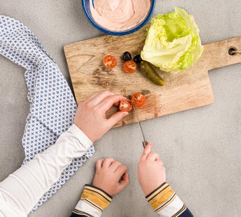 Ei und Essiggurke in Scheiben schneiden. Oliven in Ringe schneiden. Cherry-Tomaten halbieren.