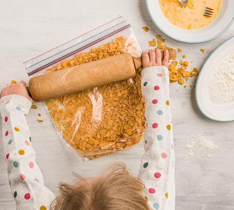Cornflakes in einen Plastikbeutel geben, mit einem Wallholz zerkleinern, in einen tiefen Teller geben.