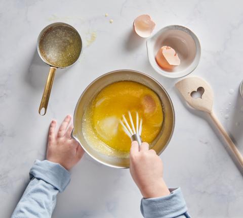 Butter in einer Pfanne schmelzen, etwas abkühlen. Milch und Eier mit der flüssigen Butter verrühren.