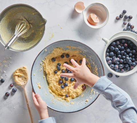 Mehl, Salz, Zucker und Backpulver in einer Schüssel mischen. Butter-Mischung dazugiessen, rasch verrühren. Heidelbeeren daruntermischen.