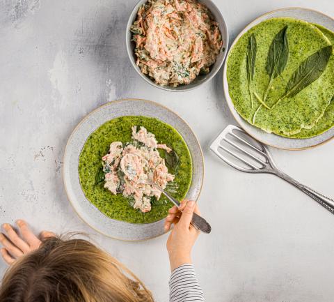 Ofen auf 60 °C vorheizen, Teller vorwärmen. Mehl und Salz in einer Schüssel mischen, in der Mitte eine Mulde eindrücken. Milchwasser, Eier und Spinat pürieren, nach und nach unter Rühren mit dem Schwingbesen in die Mulde giessen, weiterrühren, bis der Teig glatt ist. Zugedeckt bei Raumtemperatur ca. 15 Min. quellen lassen.