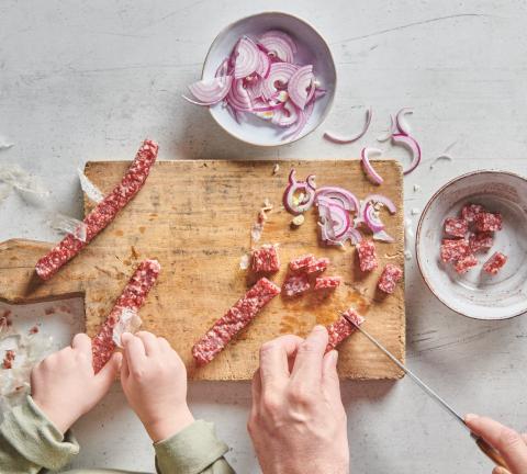 Landjäger schälen, in Scheiben schneiden. Zwiebel in Streifen schneiden.