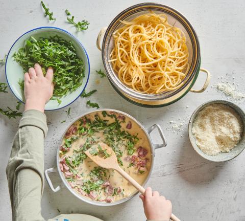Rucola grob schneiden, mit dem Käse zur Sauce geben, würzen. Sauce mit den Spaghetti mischen.