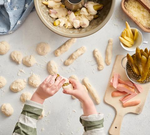 Gugelhopfform einfetten . Cervelats schälen, längs halbieren. Hälften längs dritteln und quer halbieren. Maiskölbchen längs halbieren, Essiggurken längs vierteln. Käse fein reiben. Teig in ca. 50 gleich grosse Stücke teilen, zu Rollen formen. Je 1 Stück Cervelat, Maiskölbchen oder Essiggurke damit umwickeln, abwechselnd mit dem Käse in die vorbereitete Form legen, Teig nochmals zugedeckt ca. 30 Min. aufgehen lassen.