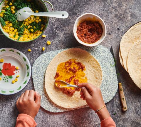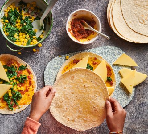 Tortillas mit der Tapenade bestreichen. Spinat und Mais auf 4 Tortillas verteilen, salzen. Käsescheiben halbieren, darauf legen.