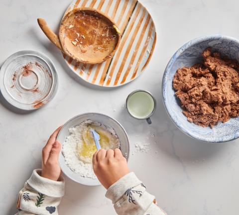 Mehl, Kakaopulver und Salz in eine Schüssel geben, mischen. Butter in Stücke schneiden, beigeben, von Hand zu einer gleichmässig krümeligen Masse verreiben.