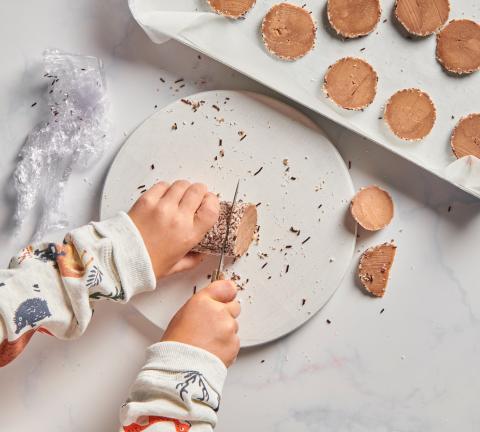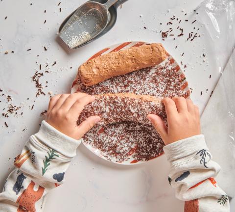 Teig halbieren, zu zwei Rollen von je ca. 4 cm Ø formen. Schokoladenstreusel und Kokosraspeln in einem flachen Teller mischen, Teigrollen darin wenden. Beide Rollen gut in Folie einpacken, ca. 1 Std. zugedeckt kühl stellen.
