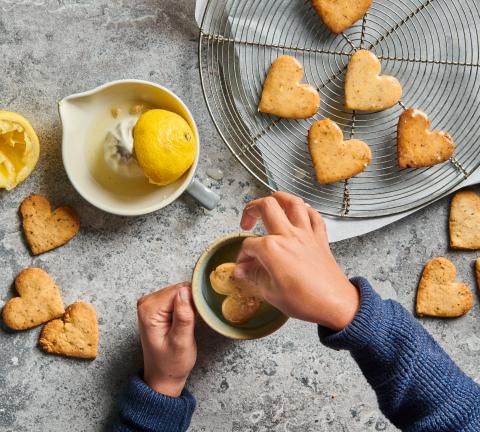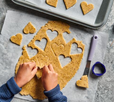 Teig portionenweise zwischen zwei Backpapier oder auf wenig Mehl ca. 4 mm dick auswallen. Herzli (ca. 6 cm Ø) ausstechen, auf zwei mit Backpapier belegte Bleche legen.