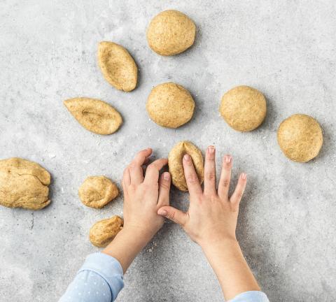 Ca. 280 g Teig zu 8 ovalen Ohren formen. Ca. 30 g zu 4 Kugeln für die Nasen rollen.