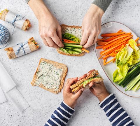 Rüebli und Gurke in der Länge der Toastbrotscheibe in Stängeli schneiden. Salatblätter ablösen, mit den Rüebli- und Gurkenstängeli auf den Frischkäse legen. Backpapier in Streifen schneiden. Belegte Toastscheiben aufrollen, mit Backpapier und Küchenschnur festbinden.