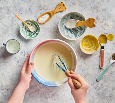 Senf, Mayonnaise, Jogurt und Essig in einer Schüssel verrühren, würzen. Sauce zugedeckt beiseitestellen.