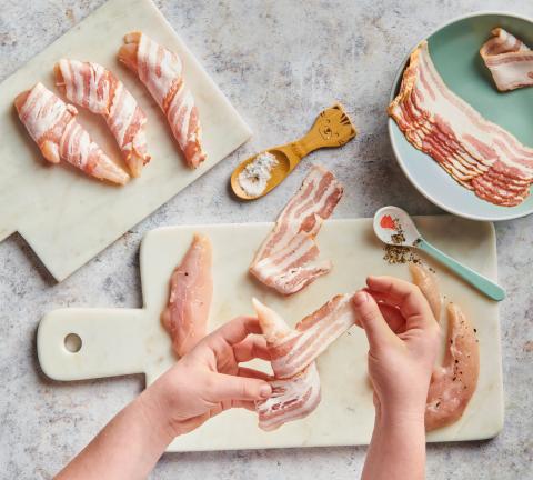 Poulet würzen und mit Speck umwickeln. Mais mit einem Messer von den Kolben schneiden. Toastbrot in Stücke zupfen. Wenig Bratbutter in einer beschichteten Bratpfanne erhitzen. Poulet rundum ca. 10 Min. anbraten, herausnehmen. Evtl. wenig Bratbutter beigeben. Mais und Toastbrot beigeben, Knoblauch dazupressen, ca. 10 Min. unter gelegentlichem Rühren braten.