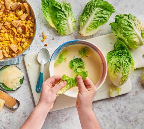 Vom Parmesan mit dem Sparschäler Späne abschälen. Salatblätter abtrennen, in mundgerechte Stücke zupfen, zur Sauce geben, mischen. Salat mit Poulet, Mais, Croûtons und Parmesan anrichten.