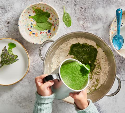 Mehl, Salz und Hefe in der Schüssel der Küchenmaschine mischen. Spinatpüree beigeben, mit dem Knethaken der Küchenmaschine ca. 5 Min. zu einem glatten Teig kneten. Zugedeckt bei Raumtemperatur ca. 2 Std. aufgehen lassen.