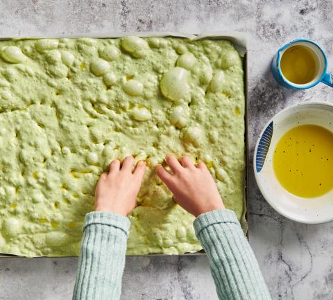 Teig mit geölten Fingern auf ein mit Backpapier belegtes Blech geben, mit den Fingern auf dem Blech ausziehen und "Dellen" eindrücken.