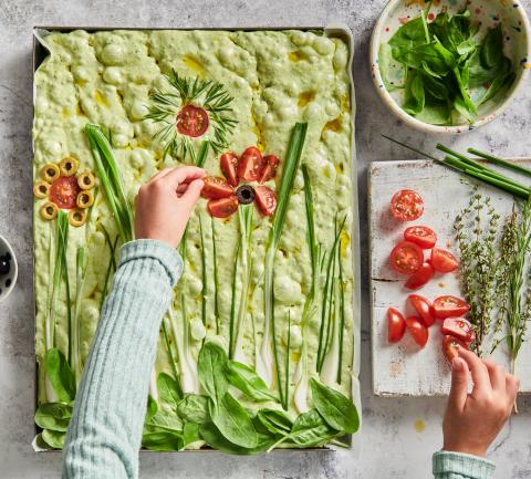 Bundzwiebeln längs in Streifen schneiden,mit den Oliven, Spinat und Kräutern die Focaccia dekorieren.