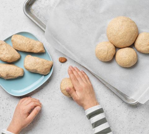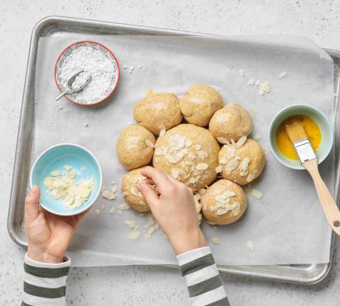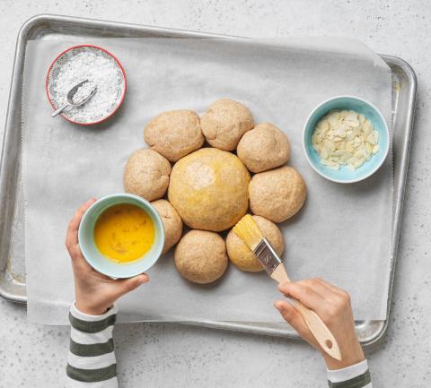 Teig in 8 kleine und 1 grosse Portion teilen. Kugeln formen, dabei die Mandel (König) in eine der kleinen Kugeln stecken. Die grosse Kugel in die Mitte das mit Backpapier belegte Blech legen, die kleinen Kugeln gleichmässig rundum verteilen, zugedeckt nochmals ca. 30 Min. aufgehen lassen.