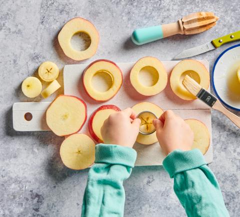Äpfel in ca. 1½ cm dicke Scheiben schneiden, Zitrone halbieren, auspressen. Bei den Apfelscheiben mithilfe des Deckels einer Pet-Flasche je in der Mitte ein Loch ausstechen. Apfelscheiben mit wenig Zitronensaft bestreichen.