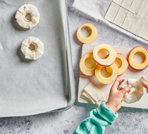 Jede Apfelscheibe mit je ca. 7 Teigstreifen umwickeln, auf ein mit Backpapier belegtes Blech legen.