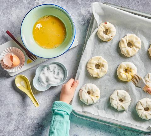 Ei verklopfen, Apfelringe damit bestreichen. Zucker darüberstreuen.