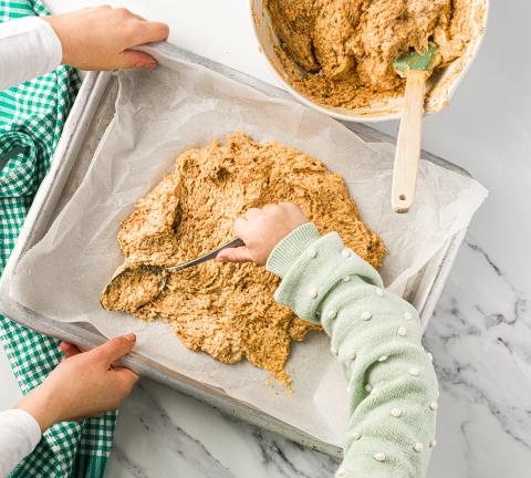 Teig auf einem mit Backpapier belegten Blech verteilen.