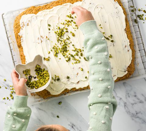 Pistazien grob hacken, über den Kuchen streuenund in Stücke schneiden.