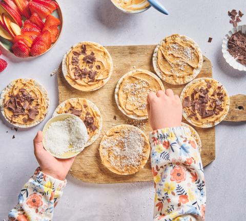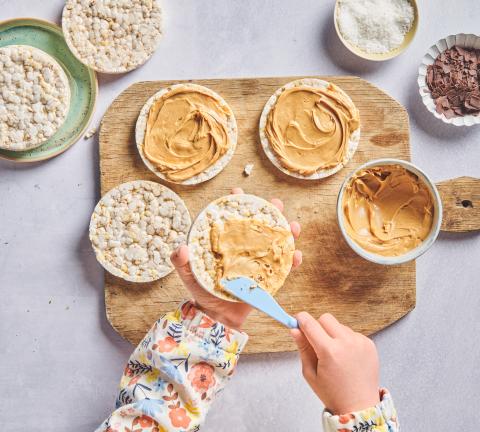 Reiswaffeln mit Erdnussbutter bestreichen.