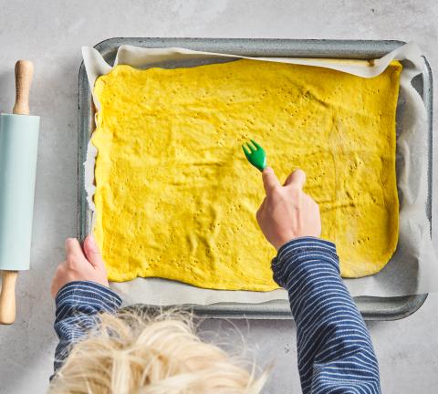 Teig halbieren, zu zwei Kugeln formen, beide auf wenig Mehl rechteckig ca. 3 mm dick auswallen, auf zwei mit Backpapier belegte Bleche legen. Teige mit einer Gabel dicht einstechen. Crème fraîche darauf verteilen, dabei ringsum einen Rand von ca. 1 cm frei lassen.