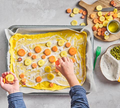 Rüebli schälen, in ca. 5 mm dicke Scheiben schneiden, darauf verteilen. Öl darüberträufeln, salzen.