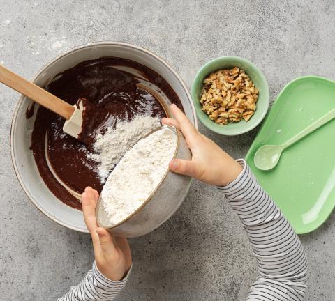 Eier, Zucker und Salz in einer Schüssel mit den Schwingbesen des Mixers schaumig rühren. Schokolade darunterrühren. Mehl und Backpulver mischen, daruntermischen. Baumnüsse grob hacken, mit 2⁄3 Kürbiswürfel daruntermischen, in die vorbereitete Form füllen.