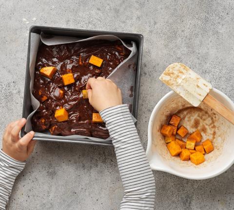 Restliche Kürbiswürfel darauf verteilen, etwas in die Masse drücken