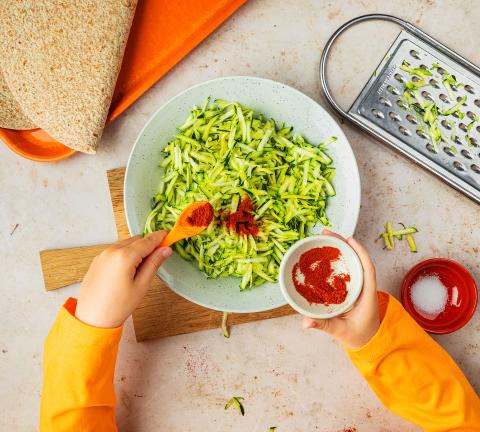 Zucchetti an der Röstiraffel grob reiben,in eine Schüssel geben, würzen.Öl in einer beschichteten Bratpfanne erhitzen. Zucchetti beigeben, ca. 4 Min. andämpfen. Herausnehmen, etwas abkühlen.