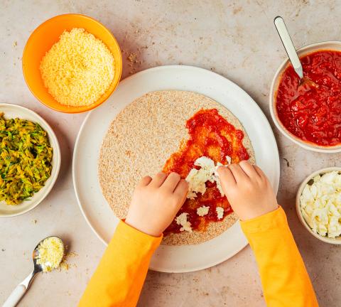 Ofen auf 60 °C vorheizen, Platte und Teller vorwärmen. Mozzarella fein zerzupfen, beiseitestellen. Tortillas bis zur Hälfte mit je ¼ Tomatensauce bestreichen, je ¼ Käse und Zucchetti darauf verteilen, freie Hälfte darüberlegen, leicht andrücken. Tortillas nacheinander in der heissen Bratpfanne mit wenig Öl beidseitig je ca. 2 Min. braten, bis der Käse leicht geschmolzen ist. Herausnehmen, warm stellen. Quesadillas vierteln, anrichten.