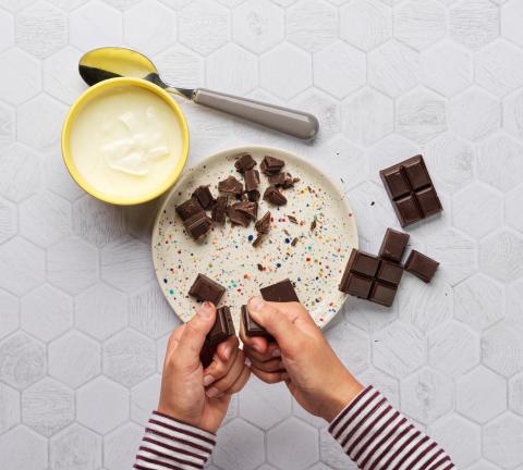Schokolade in Stücke brechen, fein hacken. Schokolade auf den Talern verteilen. Puderzucker darüberstäuben. Jogurt glattrühren, mit den Talern servieren. kids>