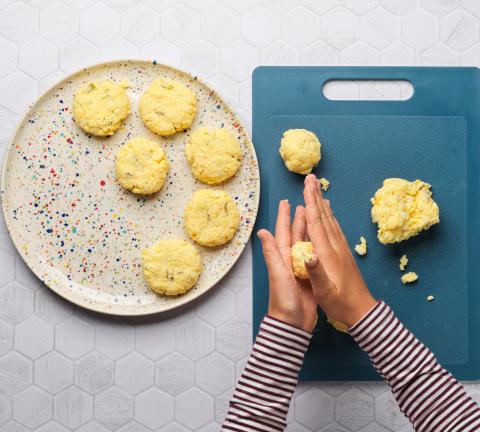 Aus der Polenta ca. 12 gleichgrosse Taler formen. Bratbutter in einer beschichteten Bratpfanne erhitzen. Taler portionenweise beidseitig je ca. 3 Min. braten. Herausnehmen, auf Tellern anrichten.