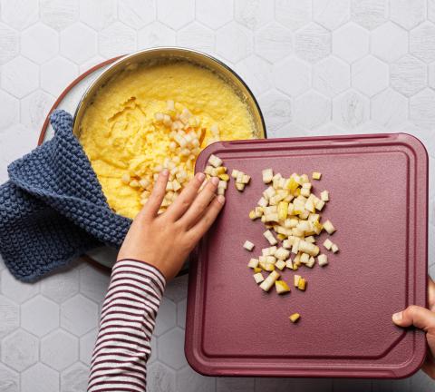 Milch in eine Pfanne giessen, aufkochen. Maisgriess und Zucker einrühren, Hitze reduzieren, unter gelegentlichem Rühren bei kleiner Hitze ca. 10 Min. zu einem dicken Brei köcheln. Pfanne von der Platte nehmen, etwas abkühlen. Birnenwürfeli beigeben, mischen. Polenta auf einem Backblech verteilen, auskühlen.