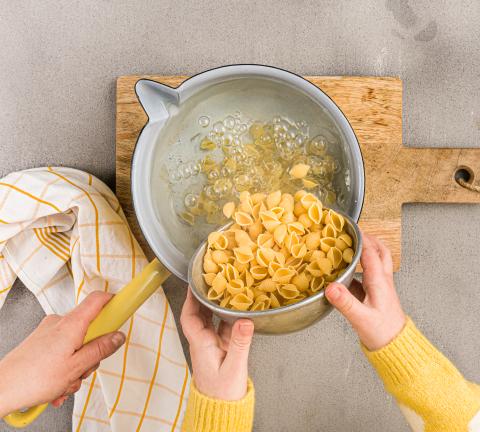 Cook the pasta in boiling salted water until al dente, drain and keep warm.
