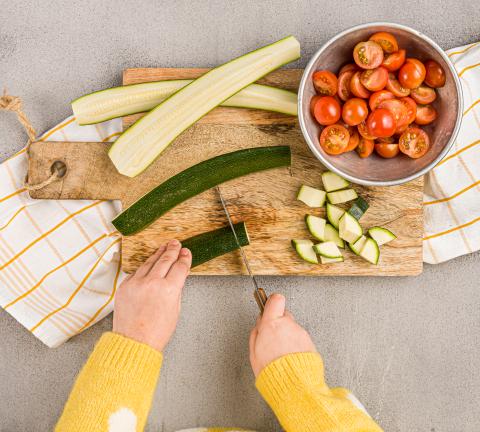 Quarter the courgette lengthwise, chop into pieces. Cut the cherry tomatoes in half.