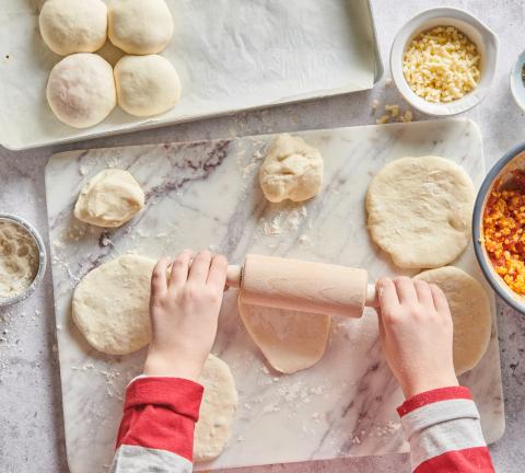 Shape the pizza dough into a roll, divide into 16 portions, shape into balls. On a lightly floured surface, roll out the pieces of dough (each approx. 10 cm in diameter).