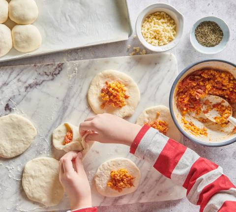 Place 2 tbsp of filling in the centre of each round of dough, shape into balls, press firmly. Arrange the dough balls (seam-side down) in a rectangle on a tray lined with baking paper. Mix the oregano and cheese, scatter on top of the pizza balls.