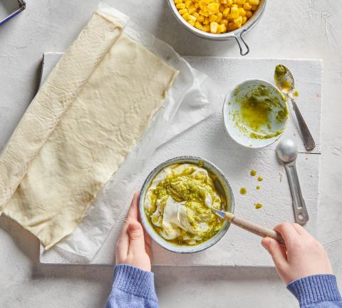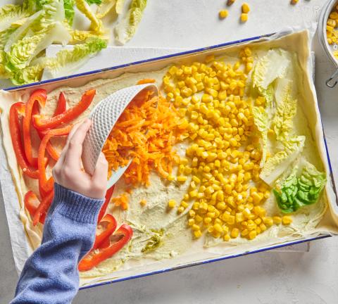 Roll out the dough, place on a baking tray. Spread the sauce on top of the dough, add the pepper, carrot, sweetcorn and lettuce.