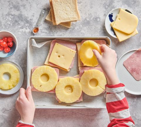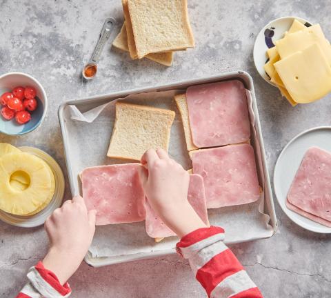 Place the slices of bread on a tray lined with baking paper. Top with 1 slice of ham and cheese.