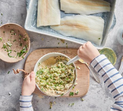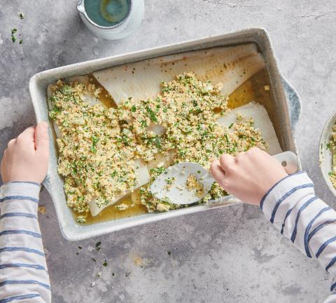 Place the fish in the gratin dish, season. Pour in the stock. Spread the crumb coating over the fish, press down firmly.