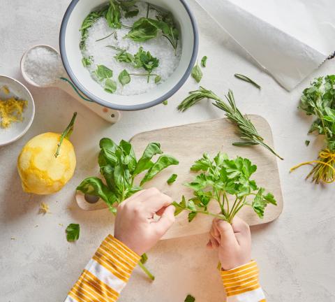 Tear the leaves off the basil, oregano and parsley, remove the needles from the rosemary. Grate the zest from the lemon, blitz everything in a food processor along with the sea salt.