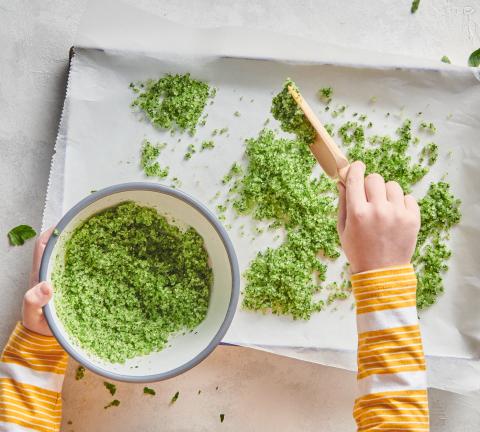 Spread the salt mixture on a baking tray lined with baking paper. Dry approx. 1 hr. in an oven preheated to 60 °C (convection) with the oven door slightly ajar. Turn off the oven and leave the salt mixture to cool. Remove.