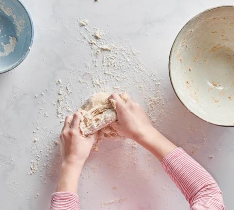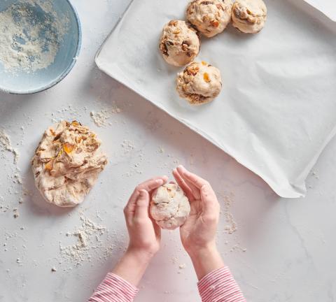 Knead the nuts and dried fruit into the dough. Divide the dough into 8 portions, shape into rolls, place in a circle on a baking tray lined with baking paper, brush with a little water. Leave the bread rolls to rise again for approx. 30 mins., dust with a little flour.
