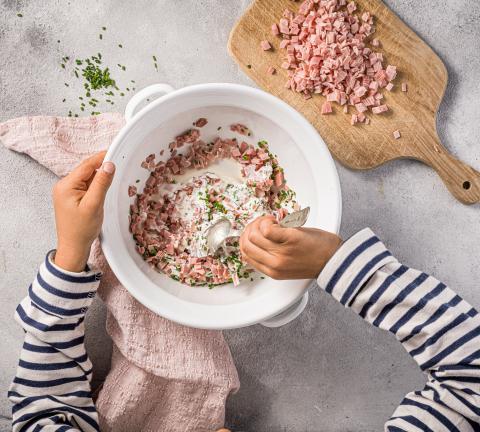 Finely chop the ham and chives, add to the quark, mix together and season.
